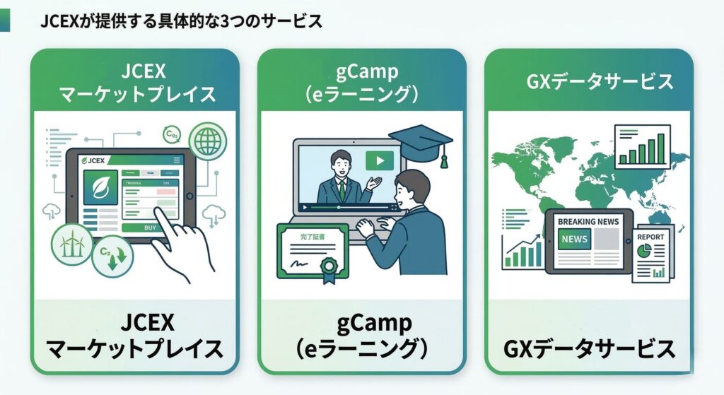 JCEX(および運営のenechain)は、単なる「売り場」の提供にとどまりません。企業の脱炭素経営をトータルでサポートするため、主に以下の3つのサービスを展開しています。